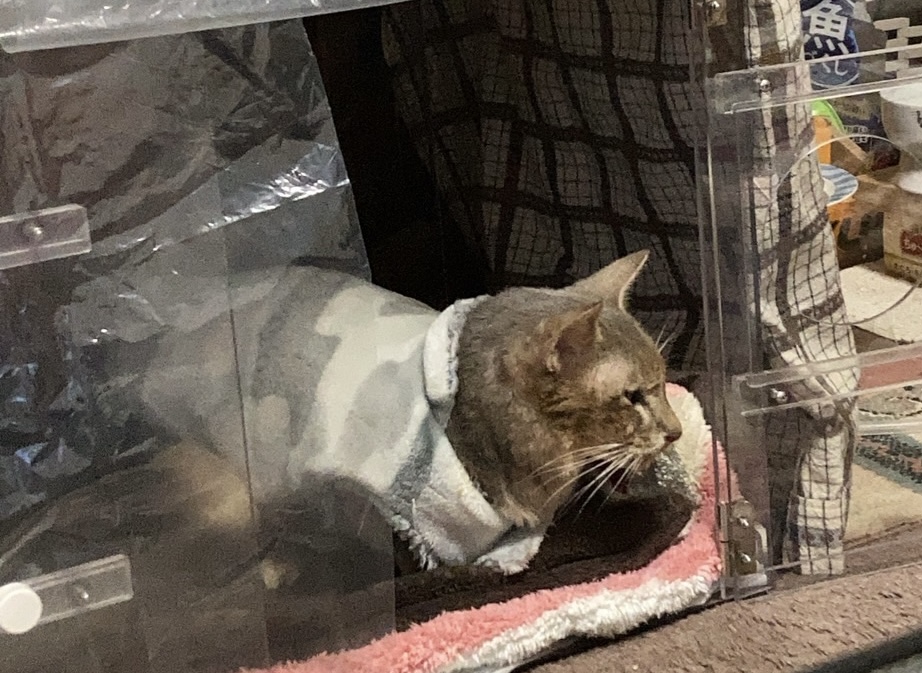 最後、動物病院の先生に教えていただいた通り、酸素室で高酸素濃度にしてちょっと落ち着いたかなと思っておりましたが、お口を湿らすお水を差し上げておやすみした後呼吸が止まってしまいました。