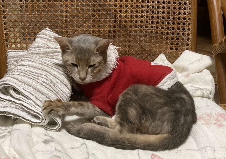南の国ではまだまだ猛暑が続いているそうですが、酷暑は過ぎたそうなので、お腹の毛が薄くなった(お腹の毛を舐めすぎたため)ネコ様にお洋服を着ていただきました。